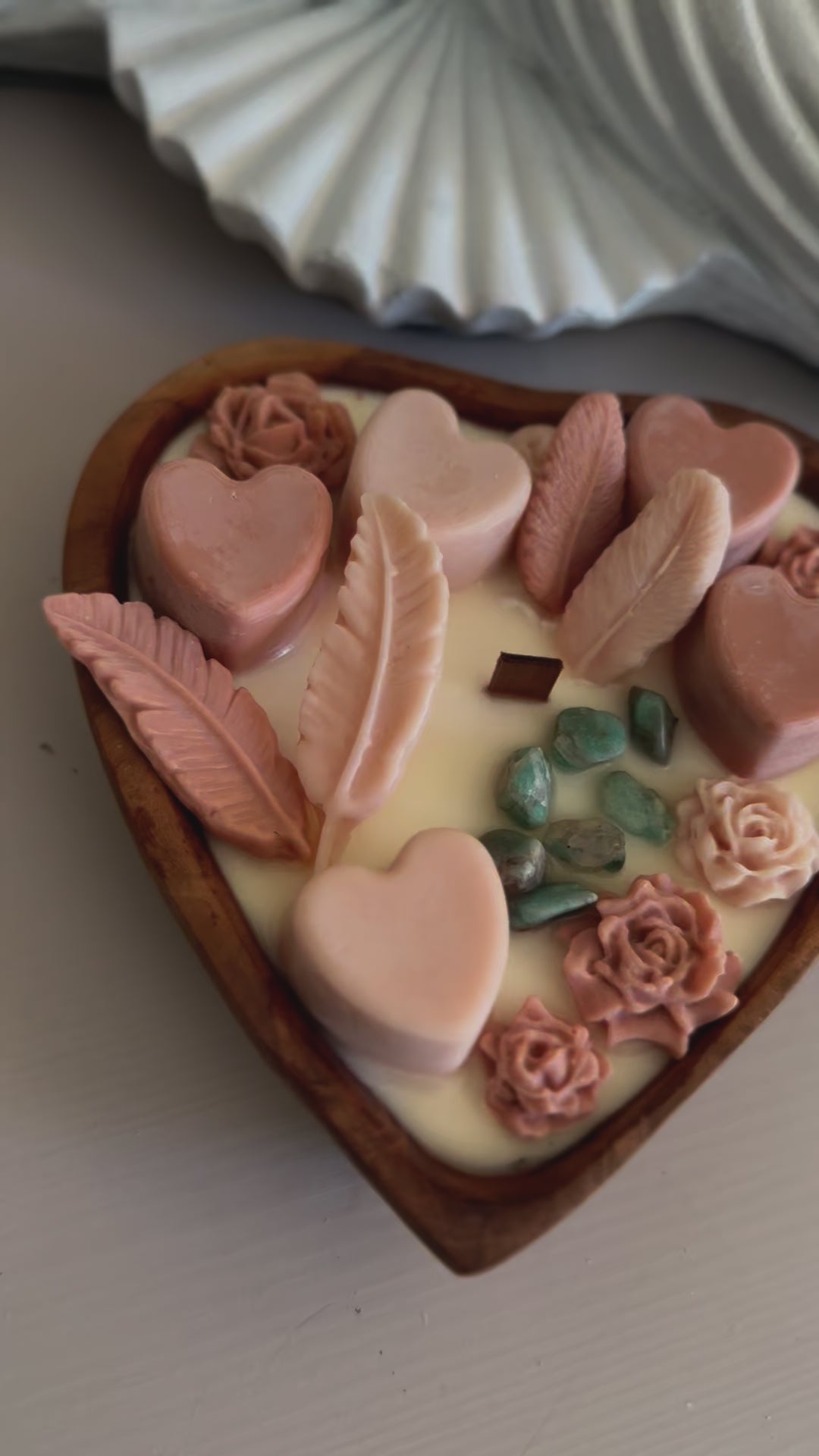 Breng liefde, rust en natuurlijke harmonie in huis met deze handgemaakte hartvormige kaars in een robuuste houten doughbowl. Gemaakt van 100% duurzame koolzaadwas, afgewerkt met Amazoniet edelstenen – de steen van innerlijke rust en balans.